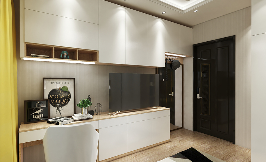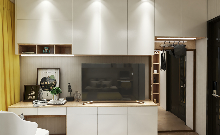 利用柜門與展示架結(jié)合避免視覺凌亂感讓空間錯(cuò)落有致,