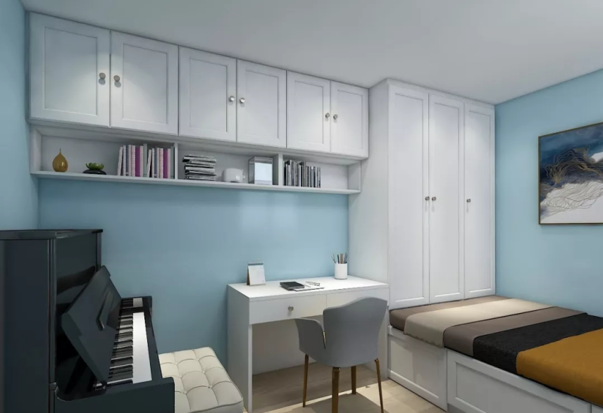 孩子的房間,學(xué)習(xí)環(huán)境至關(guān)重要,不是隨便的一桌一椅就能簡單應(yīng)付的。依墻而設(shè)的L型書桌,將傳統(tǒng)的桌柜一體的設(shè)計(jì)簡化成吧臺(tái)式。既完美利用了邊角死區(qū),又不會(huì)給人空間上的壓抑感。